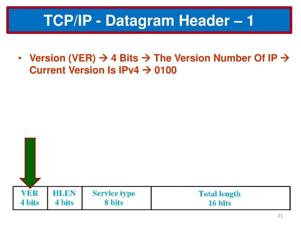 TCP/IP - Datagram Header – 1 • Version (VER) 4 Bits The Version Number Of IP Current Version Is IPv4 0100