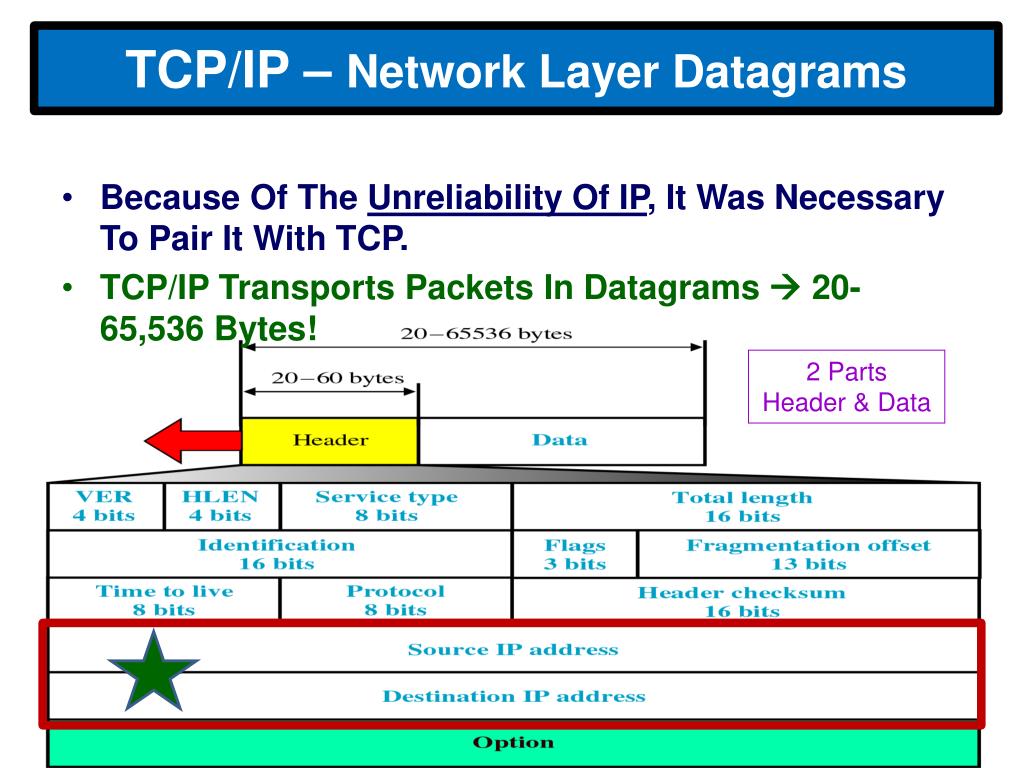 TCP/IP – Network Layer Datagrams • Because Of The Unreliability Of IP, It Was Necessary To Pair It With TCP. • TCP/IP Transports Packets In Datagrams 20-65,536 Bytes! 2 Parts Header & Data