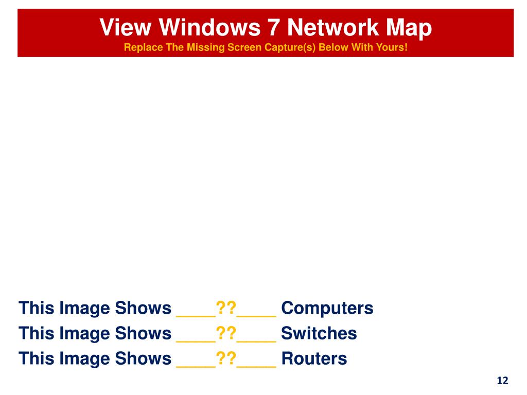 View Windows 7 Network MapReplace The Missing Screen Capture(s) Below With Yours! This Image Shows ____??____ Computers This Image Shows ____??____ Switches This Image Shows ____??____ Routers