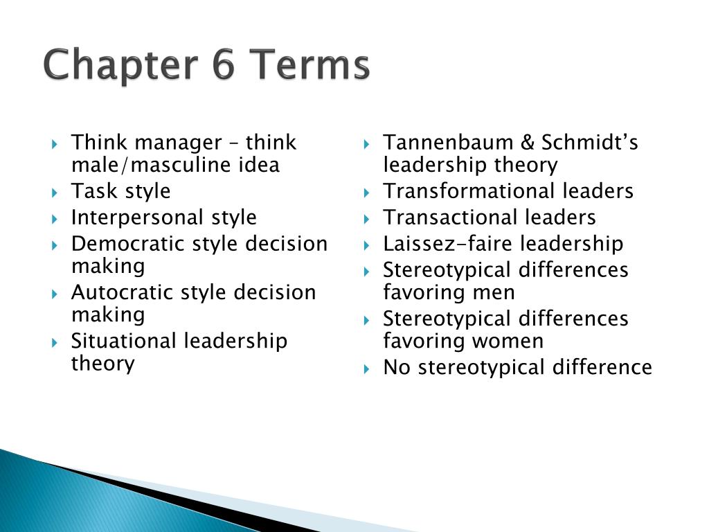 Chapter 6 Terms • Think manager – think male/masculine idea • Task style • Interpersonal style • Democratic style decision making • Autocratic style decision making • Situational leadership theory • Tannenbaum & Schmidt’s leadership theory • Transformational leaders • Transactional leaders • Laissez-faire leadership • Stereotypical differences favoring men • Stereotypical differences favoring women • No stereotypical difference