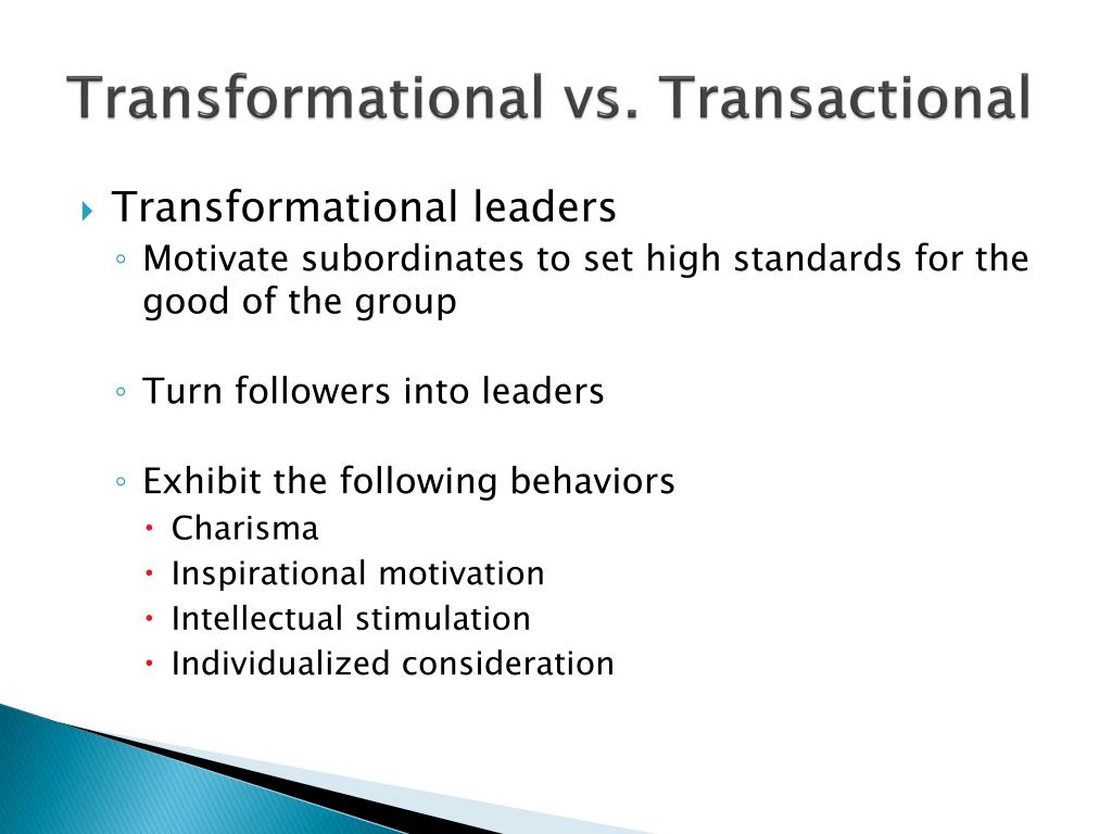 Transformational vs. Transactional • Transformational leaders • Motivate subordinates to set high standards for the good of the group • Turn followers into leaders • Exhibit the following behaviors • Charisma • Inspirational motivation • Intellectual stimulation • Individualized consideration