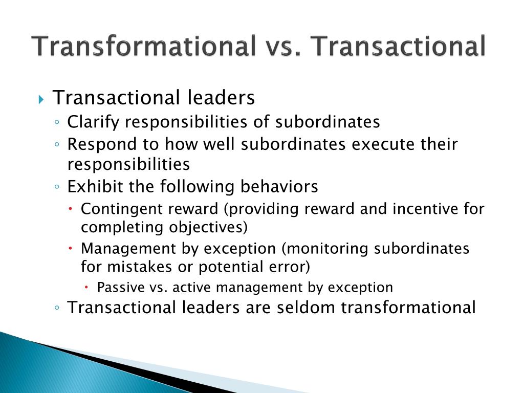 Transformational vs. Transactional • Transactional leaders • Clarify responsibilities of subordinates • Respond to how well subordinates execute their responsibilities • Exhibit the following behaviors • Contingent reward (providing reward and incentive for completing objectives) • Management by exception (monitoring subordinates for mistakes or potential error) • Passive vs. active management by exception • Transactional leaders are seldom transformational