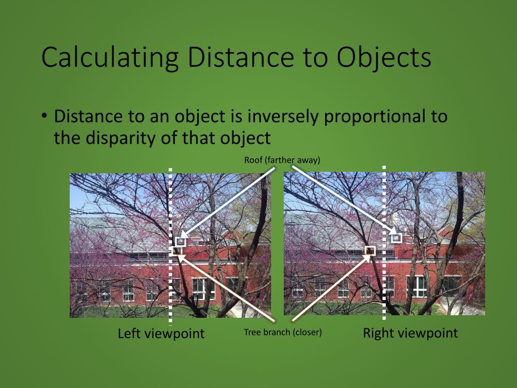 Calculating Distance to Objects • Distance to an object is inversely proportional to the disparity of that object Roof (farther away) Right viewpoint Left viewpoint Tree branch (closer)