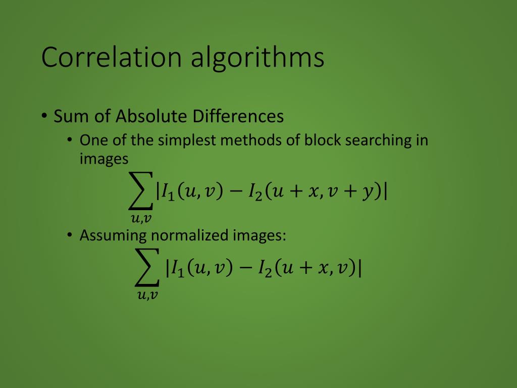 Correlation algorithms • Sum of Absolute Differences • One of the simplest methods of block searching in images • Assuming normalized images: