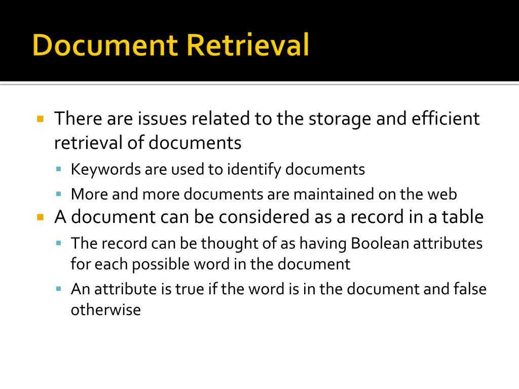 Document Retrieval • There are issues related to the storage and efficient retrieval of documents • Keywords are used to identify documents • More and more documents are maintained on the web • A document can be considered as a record in a table • The record can be thought of as having Boolean attributes for each possible word in the document • An attribute is true if the word is in the document and false otherwise