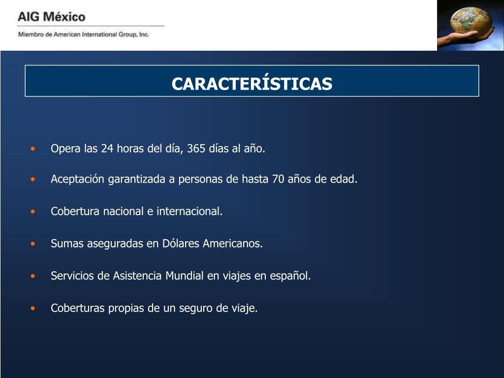 CARACTERÍSTICAS • Opera las 24 horas del día, 365 días al año. • Aceptación garantizada a personas de hasta 70 años de edad. • Cobertura nacional e internacional. • Sumas aseguradas en Dólares Americanos. • Servicios de Asistencia Mundial en viajes en español. • Coberturas propias de un seguro de viaje.