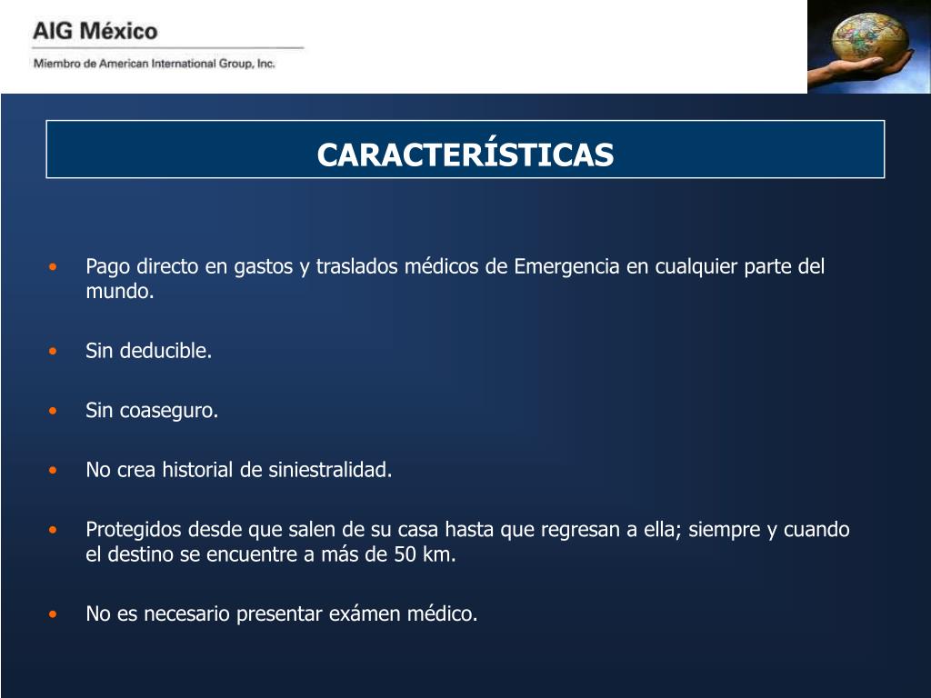 CARACTERÍSTICAS • Pago directo en gastos y traslados médicos de Emergencia en cualquier parte del mundo. • Sin deducible. • Sin coaseguro. • No crea historial de siniestralidad. • Protegidos desde que salen de su casa hasta que regresan a ella; siempre y cuando el destino se encuentre a más de 50 km. • No es necesario presentar exámen médico.