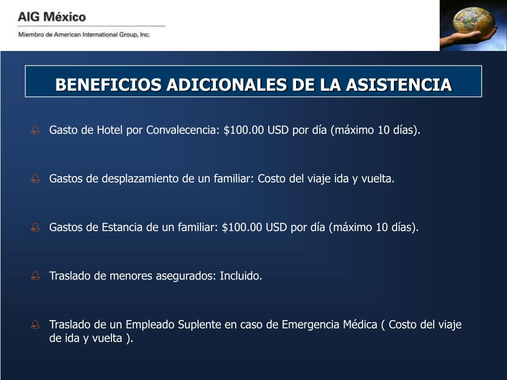 BENEFICIOS ADICIONALES DE LA ASISTENCIA • Gasto de Hotel por Convalecencia: $100.00 USD por día (máximo 10 días). • Gastos de desplazamiento de un familiar: Costo del viaje ida y vuelta. • Gastos de Estancia de un familiar: $100.00 USD por día (máximo 10 días). • Traslado de menores asegurados: Incluido. • Traslado de un Empleado Suplente en caso de Emergencia Médica ( Costo del viaje de ida y vuelta ).