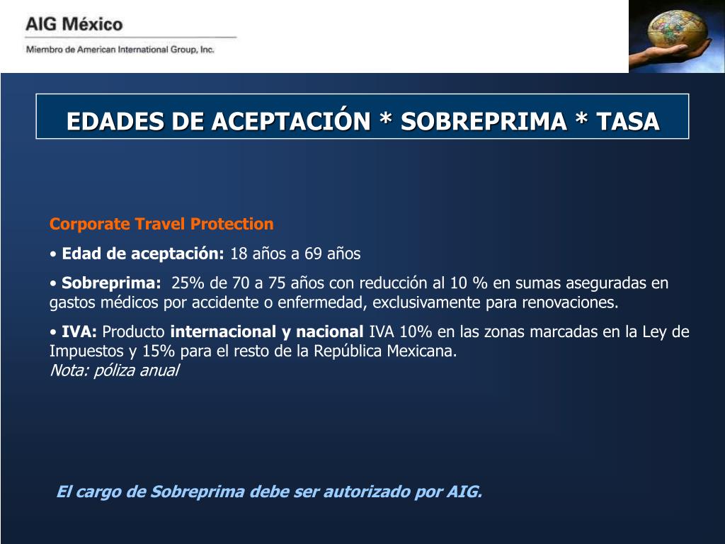 EDADES DE ACEPTACIÓN * SOBREPRIMA * TASA • Corporate Travel Protection • Edad de aceptación: 18 años a 69 años • Sobreprima: 25% de 70 a 75 años con reducción al 10 % en sumas aseguradas en gastos médicos por accidente o enfermedad, exclusivamente para renovaciones. • IVA: Producto internacional y nacional IVA 10% en las zonas marcadas en la Ley de Impuestos y 15% para el resto de la República Mexicana. Nota: póliza anual El cargo de Sobreprima debe ser autorizado por AIG.