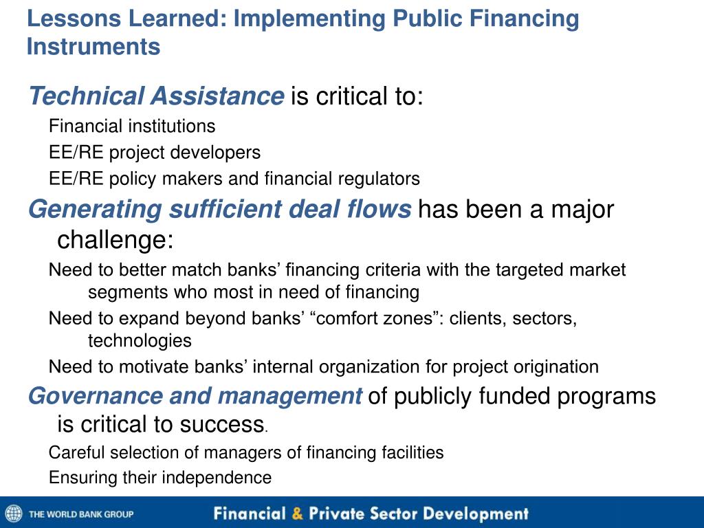 Which public financing instruments maximize financial leverage ? • Engaging domestic banks through credit lines and guarantees: high leverage of public funds and good prospects of sustainability • Technical Assistance (TA): critical with high pay-off,particularly when packaged with public financing instruments