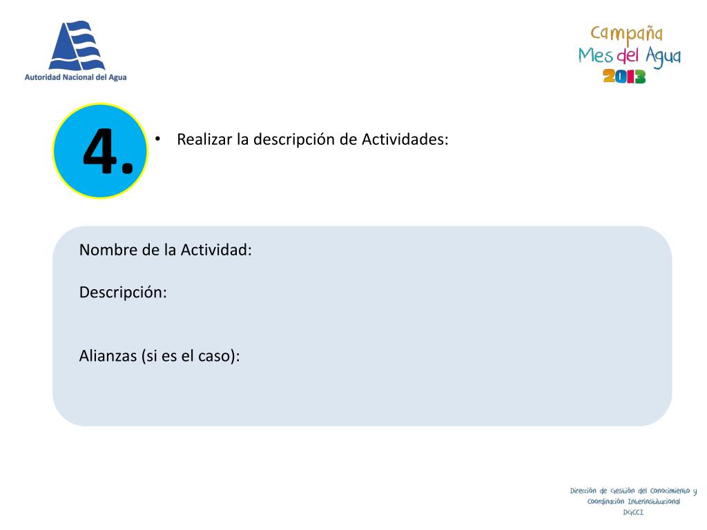 4. • Realizar la descripción de Actividades: Nombre de la Actividad: Descripción: Alianzas (si es el caso):