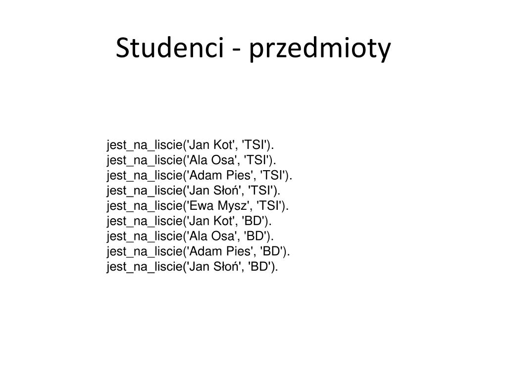 Studenci - przedmioty jest_na_liscie('Jan Kot', 'TSI'). jest_na_liscie('Ala Osa', 'TSI'). jest_na_liscie('Adam Pies', 'TSI'). jest_na_liscie('Jan Słoń', 'TSI'). jest_na_liscie('Ewa Mysz', 'TSI'). jest_na_liscie('Jan Kot', 'BD'). jest_na_liscie('Ala Osa', 'BD'). jest_na_liscie('Adam Pies', 'BD'). jest_na_liscie('Jan Słoń', 'BD').