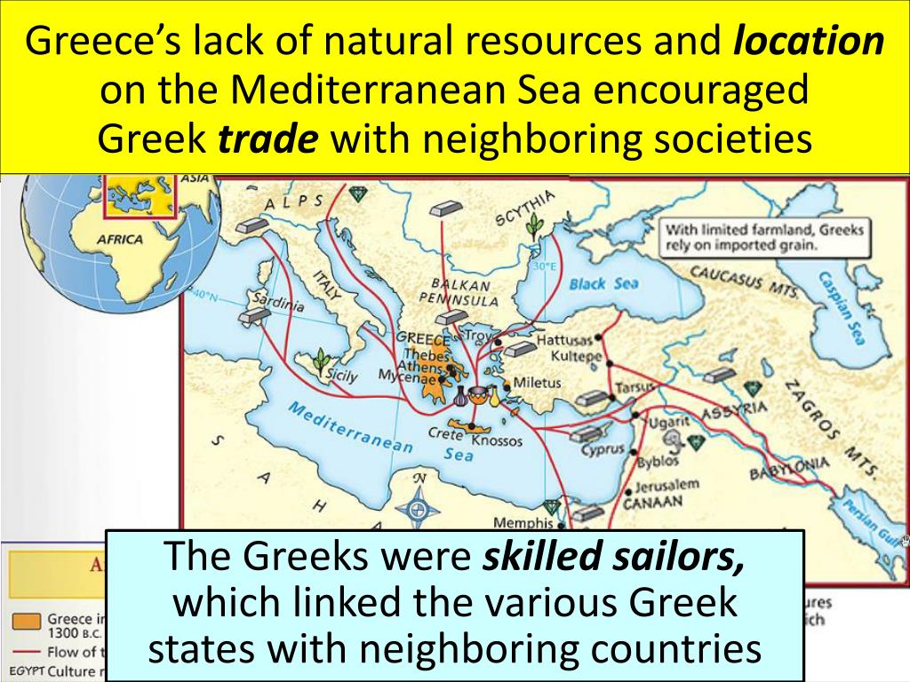 Greece’s lack of natural resources and location on the Mediterranean Sea encouraged Greek trade with neighboring societies The Greeks were skilled sailors, which linked the various Greek states with neighboring countries