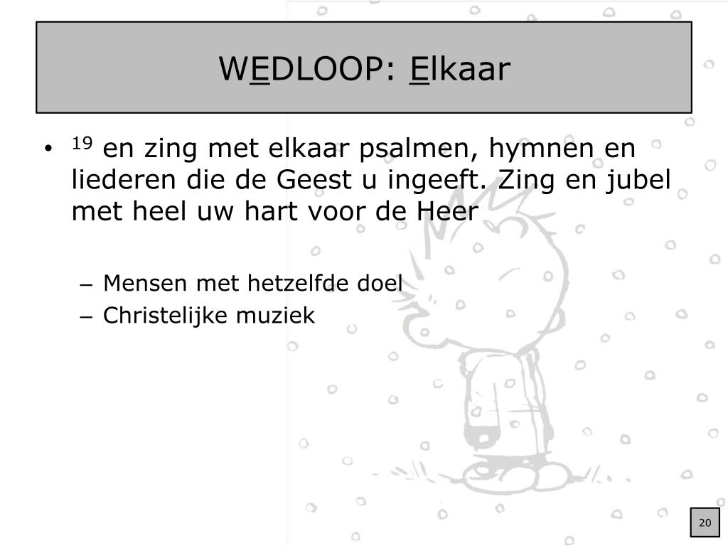 WEDLOOP: Elkaar • 19 en zing met elkaar psalmen, hymnen en liederen die de Geest u ingeeft. Zing en jubel met heel uw hart voor de Heer • Mensen met hetzelfde doel • Christelijke muziek