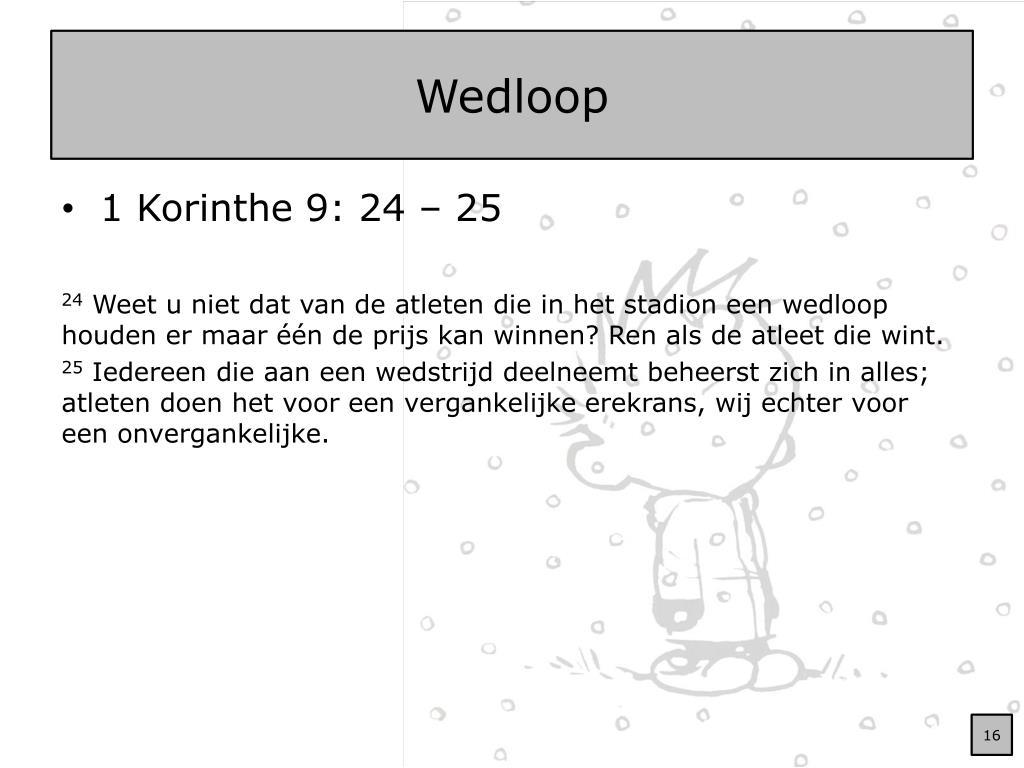 Wedloop 1 Korinthe 9: 24 – 25 24 Weet u niet dat van de atleten die in het stadion een wedloop houden er maar één de prijs kan winnen? Ren als de atleet die wint. 25 Iedereen die aan een wedstrijd deelneemt beheerst zich in alles; atleten doen het voor een vergankelijke erekrans, wij echter voor een onvergankelijke.