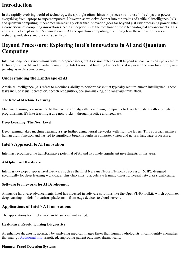 Introduction In the rapidly evolving world of technology, the spotlight often shines on processors—those little chips that power everything from laptops to supercomputers. However, as we delve deeper into the realms of artificial intelligence (AI) and quantum computing, it becomes increasingly clear that innovation goes far beyond just raw processing power. Intel, a cornerstone of computing innovation since its inception, is at the forefront of these technological advancements. This article aims to explore Intel's innovations in AI and quantum computing, examining how these developments are reshaping industries and our everyday lives. Beyond Processors: Exploring Intel's Innovations in AI and Quantum Computing Intel has long been synonymous with microprocessors, but its vision extends well beyond silicon. With an eye on future technologies like AI and quantum computing, Intel is not just building faster chips; it is paving the way for entirely new paradigms in data processing. Understanding the Landscape of AI Artificial Intelligence (AI) refers to machines' ability to perform tasks that typically require human intelligence. These tasks include visual perception, speech recognition, decision-making, and language translation. The Role of Machine Learning Machine learning is a subset of AI that focuses on algorithms allowing computers to learn from data without explicit programming. It’s like teaching a dog new tricks—through practice and feedback. Deep Learning: The Next Level Deep learning takes machine learning a step further using neural networks with multiple layers. This approach mimics human brain function and has led to significant breakthroughs in computer vision and natural language processing. Intel’s Approach to AI Innovation Intel has recognized the transformative potential of AI and has made significant investments in this area. AI-Optimized Hardware Intel has developed specialized hardware such as the Intel Nervana Neural Network Processor (NNP), designed specifically for deep learning workloads. This chip aims to accelerate training times for neural networks significantly. Software Frameworks for AI Development Alongside hardware advancements, Intel has invested in software solutions like the OpenVINO toolkit, which optimizes deep learning models for various platforms—from edge devices to cloud servers. Applications of Intel’s AI Innovations The applications for Intel’s work in AI are vast and varied. Healthcare: Revolutionizing Diagnostics AI enhances diagnostic accuracy by analyzing medical images faster than human radiologists. It can identify anomalies that may go Additional info unnoticed, improving patient outcomes dramatically. Finance: Fraud Detection Systems
