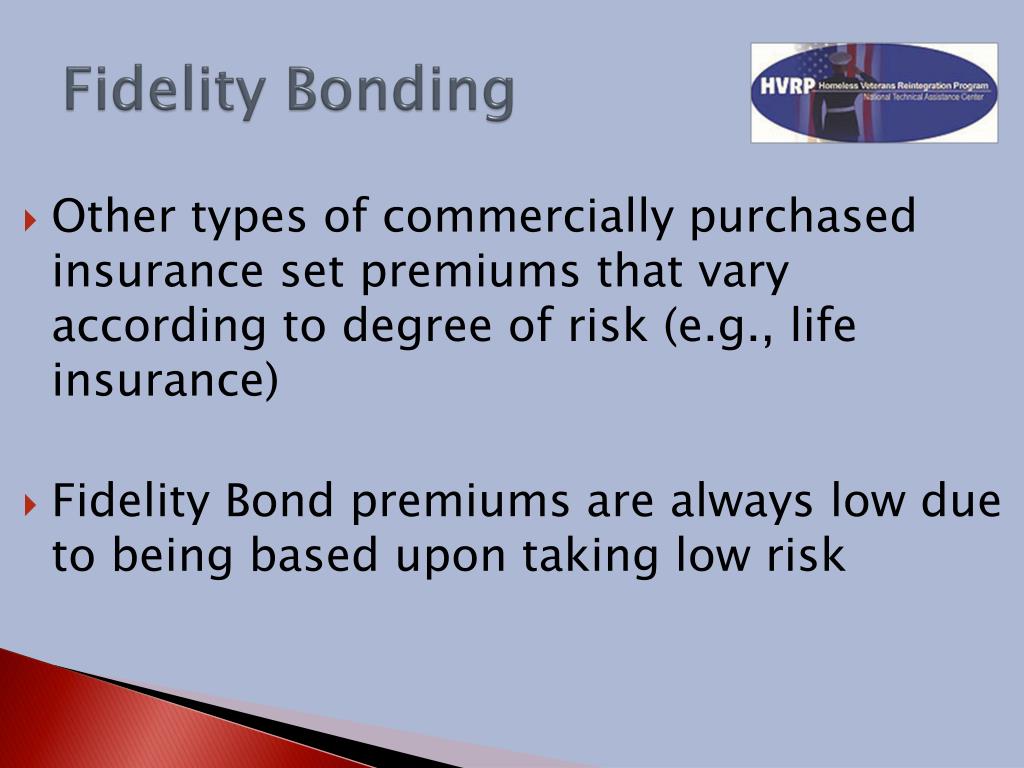 Fidelity Bonding • Insurance purchased to indemnify employers for loss of money or property sustained through the dishonest acts of their employees (i.e., theft, forgery, larceny, and embezzlement) • AKA “employee dishonesty insurance” • Considered good business management practice & purchased by most employers