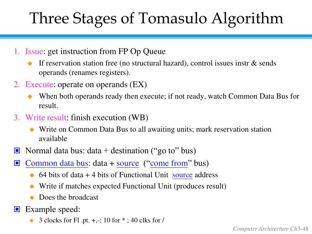 Three Stages of Tomasulo Algorithm • Issue: get instruction from FP Op Queue • If reservation station free (no structural hazard), control issues instr & sends operands (renames registers). • Execute: operate on operands (EX) • When both operands ready then execute; if not ready, watch Common Data Bus for result. • Write result: finish execution (WB) • Write on Common Data Bus to all awaiting units; mark reservation station available • Normal data bus: data + destination (“go to” bus) • Common data bus: data + source (“come from” bus) • 64 bits of data + 4 bits of Functional Unit source address • Write if matches expected Functional Unit (produces result) • Does the broadcast • Example speed: • 3 clocks for Fl .pt. +,-; 10 for * ; 40 clks for /