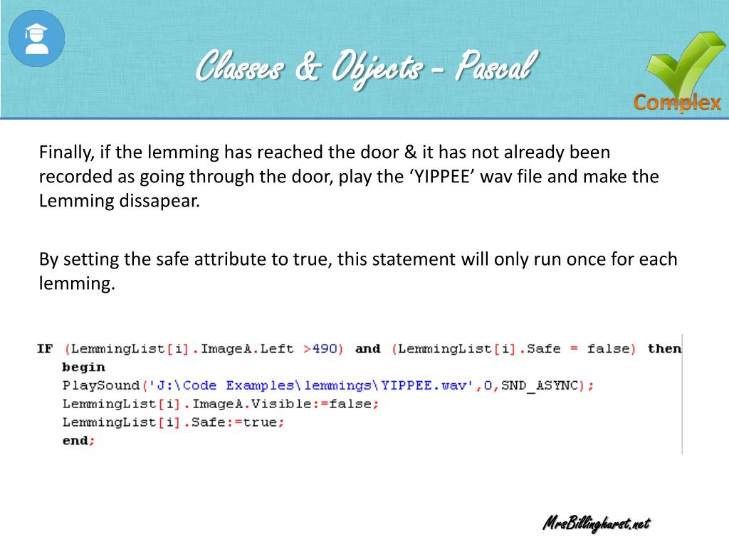 Classes & Objects - Pascal Complex Finally, if the lemming has reached the door & it has not already been recorded as going through the door, play the ‘YIPPEE’ wav file and make the Lemming dissapear. By setting the safe attribute to true, this statement will only run once for each lemming.