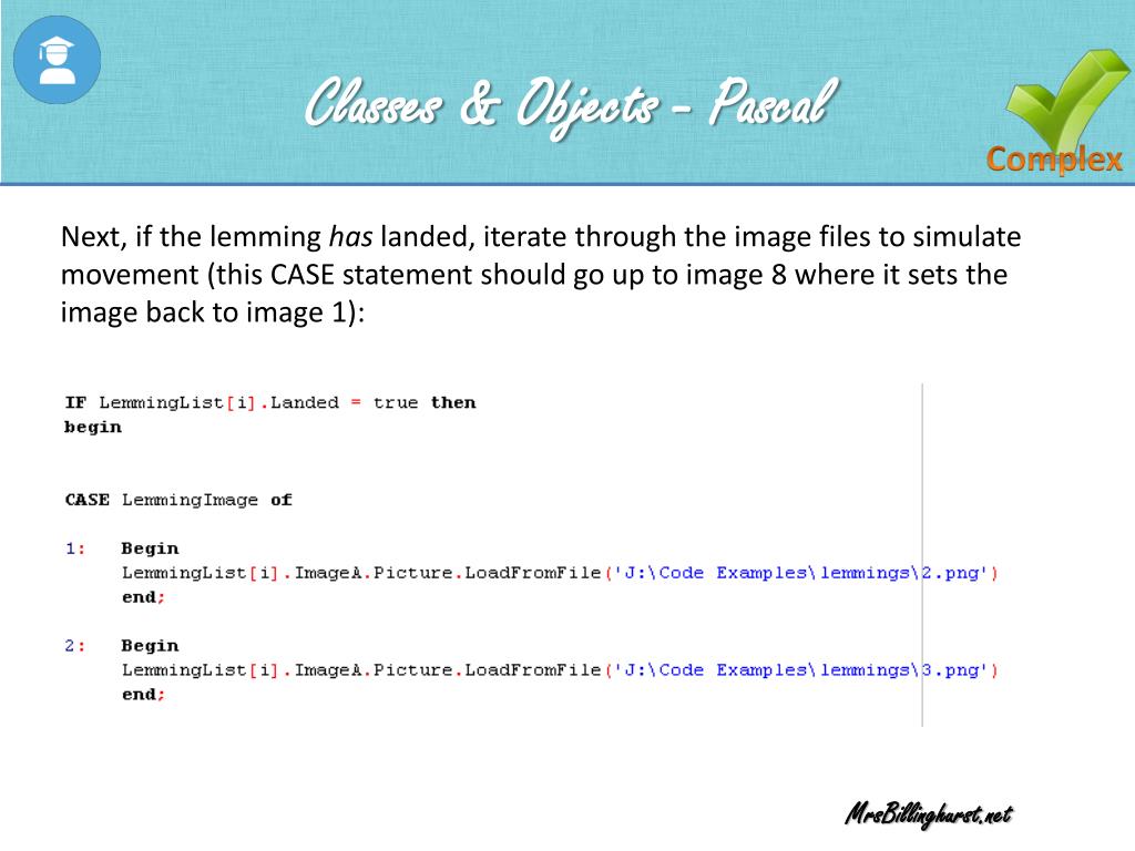 Classes & Objects - Pascal Complex Next, if the lemming has landed, iterate through the image files to simulate movement (this CASE statement should go up to image 8 where it sets the image back to image 1):