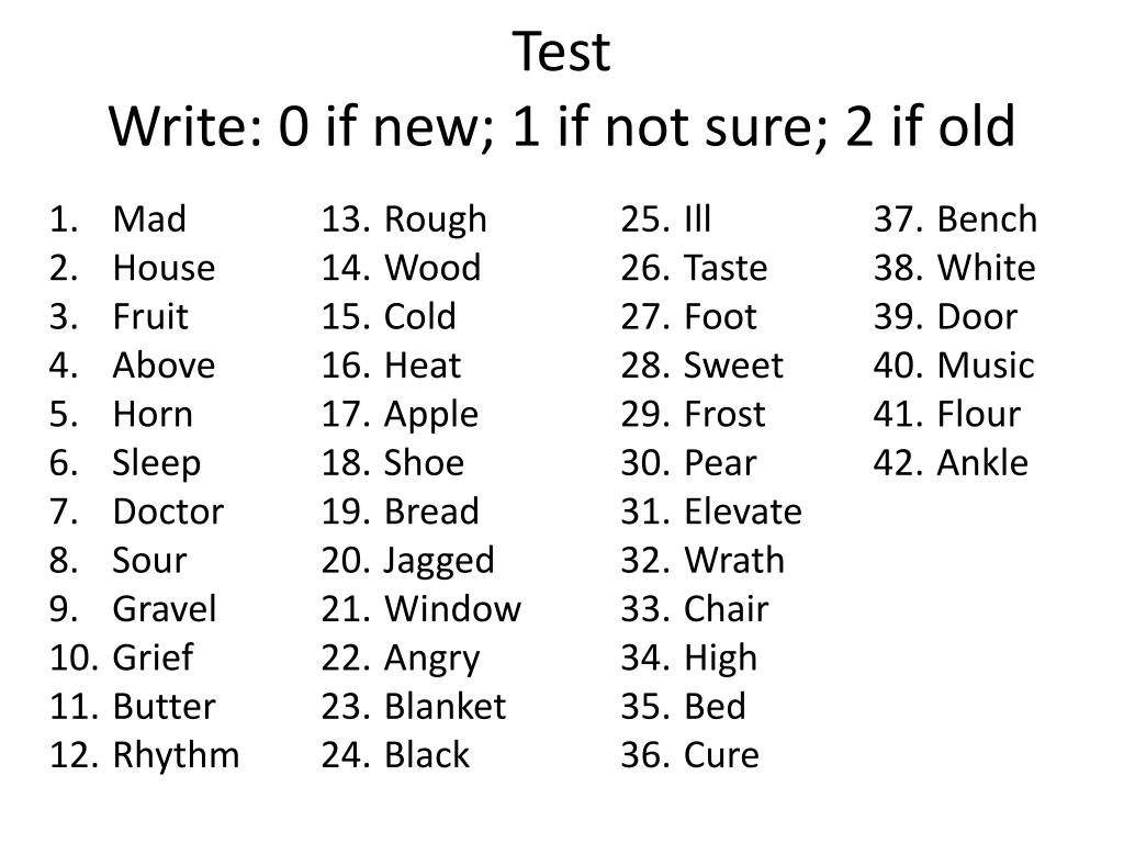TestWrite: 0 if new; 1 if not sure; 2 if old • Mad • House • Fruit • Above • Horn • Sleep • Doctor • Sour • Gravel • Grief • Butter • Rhythm • Rough • Wood • Cold • Heat • Apple • Shoe • Bread • Jagged • Window • Angry • Blanket • Black Ill Taste Foot Sweet Frost Pear Elevate Wrath Chair High Bed Cure Bench White Door Music Flour Ankle