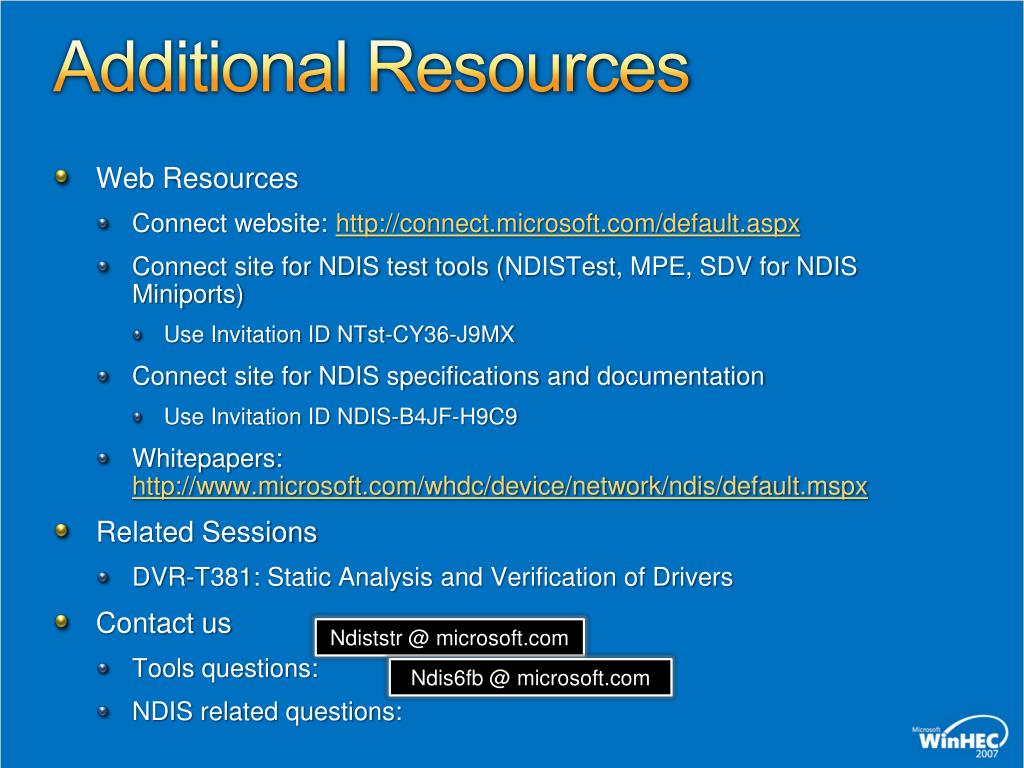 Additional Resources • Web Resources • Connect website: http://connect.microsoft.com/default.aspx • Connect site for NDIS test tools (NDISTest, MPE, SDV for NDIS Miniports) • Use Invitation ID NTst-CY36-J9MX • Connect site for NDIS specifications and documentation • Use Invitation ID NDIS-B4JF-H9C9 • Whitepapers: http://www.microsoft.com/whdc/device/network/ndis/default.mspx • Related Sessions • DVR-T381: Static Analysis and Verification of Drivers • Contact us • Tools questions: • NDIS related questions: Ndiststr @ microsoft.com Ndis6fb @ microsoft.com