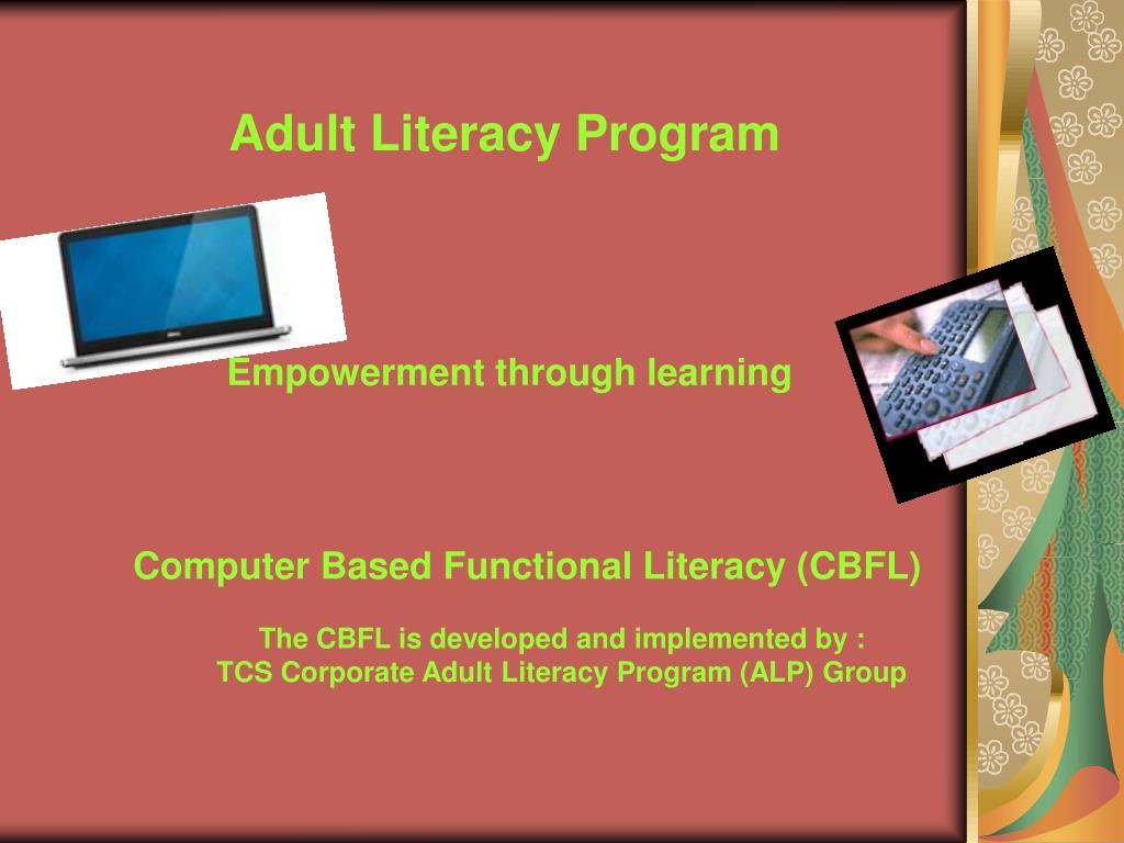 Adult literacy. Adult literacy. Adult literacy. Adult literacy. Adult Literacy Program. Empowerment through learning. Computer Based Functional Literacy (CBFL). The CBFL is developed and implemented by : TCS Corporate Adult Literacy Program (ALP) Group . Literacy - India.