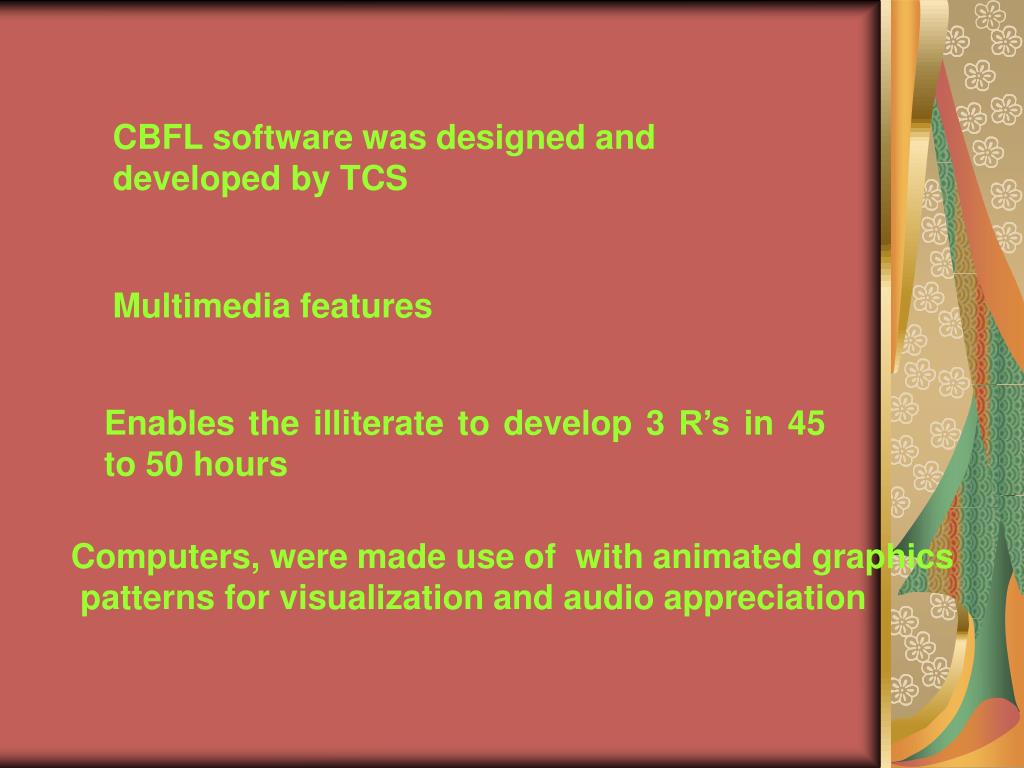 CBFL software was designed and developed by TCS Multimedia features Enables the illiterate to develop 3 R’s in 45 to 50 hours Computers, were made use of with animated graphics patterns for visualization and audio appreciation