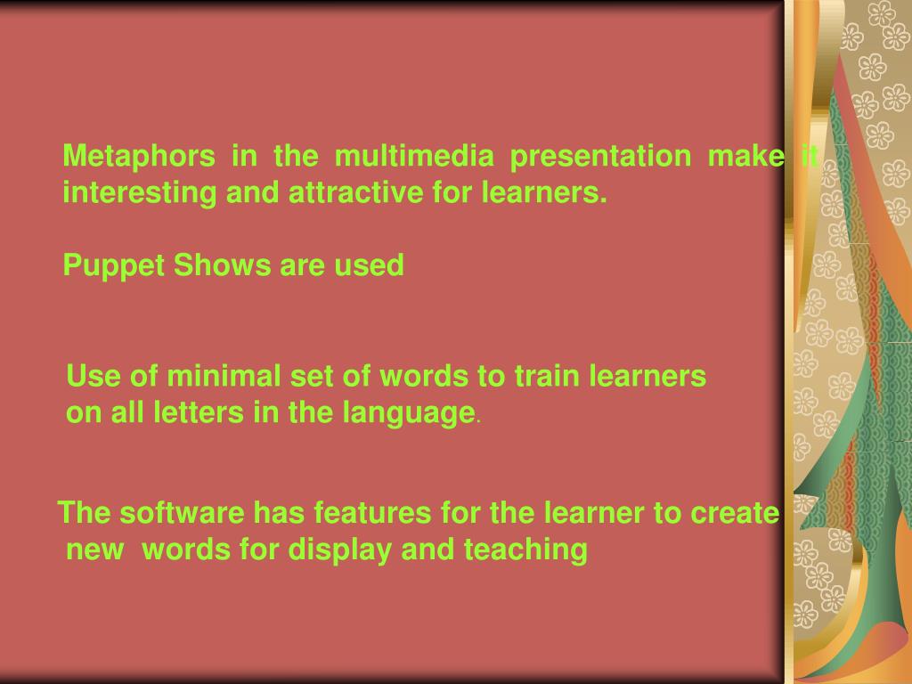 Metaphors in the multimedia presentation make it interesting and attractive for learners. Puppet Shows are used Use of minimal set of words to train learners on all letters in the language. The software has features for the learner to create new words for display and teaching