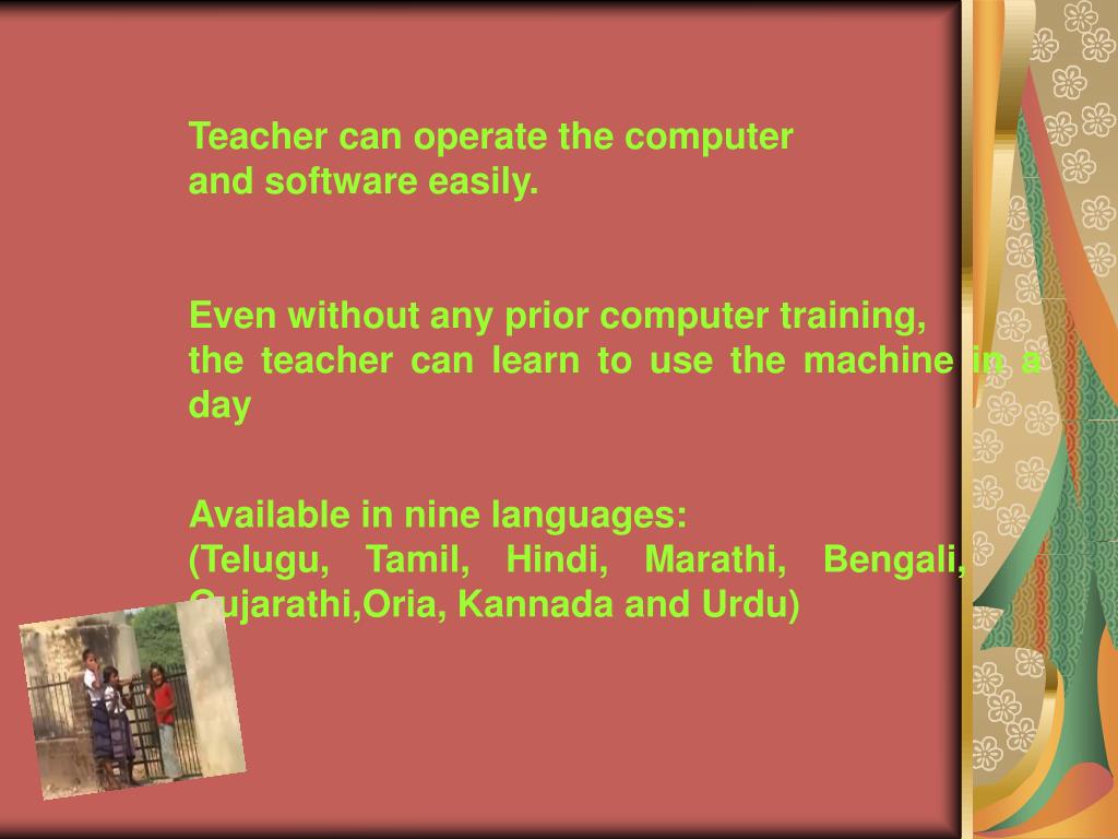 Teacher can operate the computer and software easily. Even without any prior computer training, the teacher can learn to use the machine in a day Available in nine languages: (Telugu, Tamil, Hindi, Marathi, Bengali, Gujarathi,Oria, Kannada and Urdu)