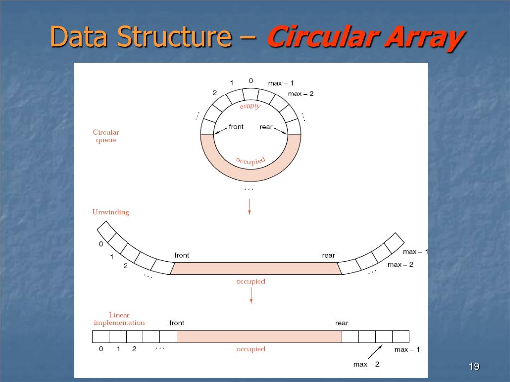 The class Queue – Circular Array class Queue { public: Queue(); void clear(); bool empty() const; bool full() const; int size() const; Error_code retrieve(Queue_entry &) const; Error_code serve(); Error_code retrieve_and_serve(Queue_entry &); Error_code append(const Queue_entry &); void print() const; private: intnext(int n) const; intfront, rear; Queue_entry entry[max]; };