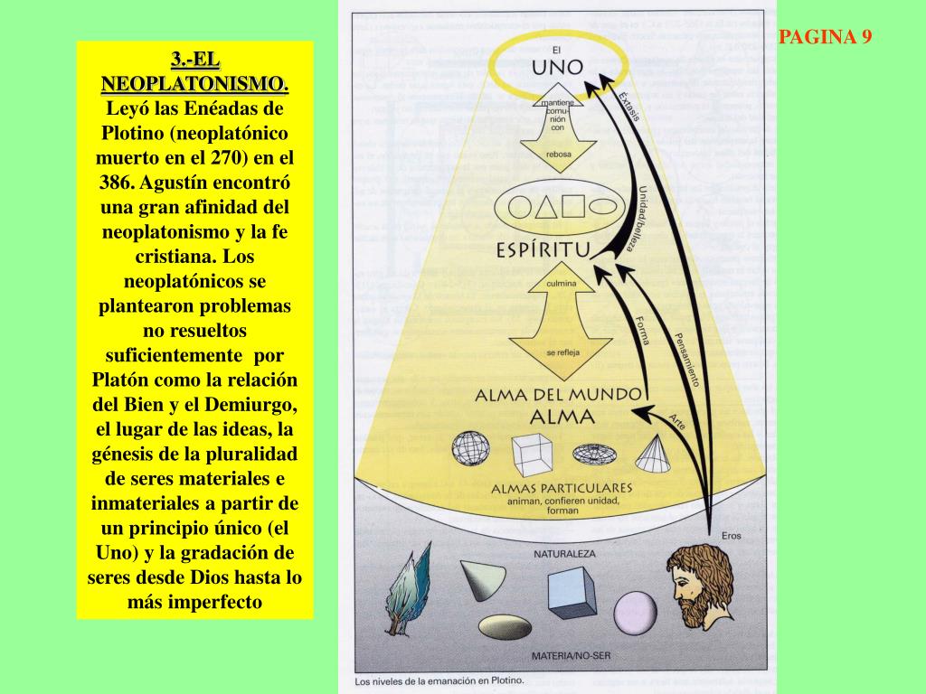 PAGINA 9 3.-EL NEOPLATONISMO. Leyó las Enéadas de Plotino (neoplatónico muerto en el 270) en el 386. Agustín encontró una gran afinidad del neoplatonismo y la fe cristiana. Los neoplatónicos se plantearon problemas no resueltos suficientemente por Platón como la relación del Bien y el Demiurgo, el lugar de las ideas, la génesis de la pluralidad de seres materiales e inmateriales a partir de un principio único (el Uno) y la gradación de seres desde Dios hasta lo más imperfecto