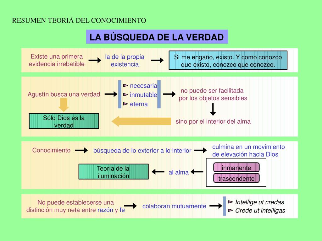LA ILUMINACIÓN. Es el concepto fundamental de la teoría del conocimiento de San Agustín. Dios concede a la razón humana un poder por el cual alcanza las verdades eternas. Los paganos no pueden conocer la verdad ya que no son iluminados por Dios. El conocimiento es un proceso de interiorización. No salgas fuera (los sentidos, el conocimiento sensible), la verdad habita en el hombre interior, en la intimidad de la conciencia. Clara influencia de Platón (Idea de Bien, sol que ilumina) y el neoplatonismo. La función iluminadora corresponde a Dios. El hombre se autotrasciende (va más allá de sí mismo) en el conocimiento. El hombre que es mutable encuentra en su interior verdades inmutables, verdades que sólo ha podido poner un ser inmutable Dios. CONCLUSIÓN: La verdad sólo es posible para el ser humano si Dios nos da el poder para conocerla. No hay autonomía de la razón. PAGINA 16 y 17