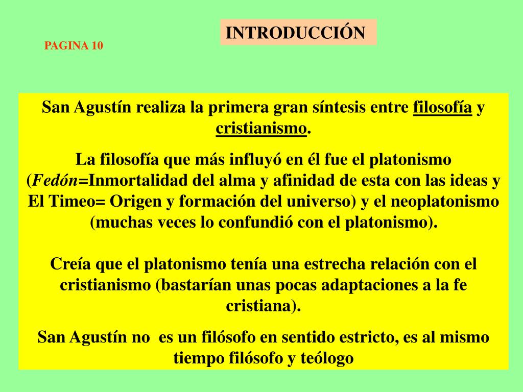 INTRODUCCIÓN PAGINA 10 San Agustín realiza la primera gran síntesis entre filosofía y cristianismo. La filosofía que más influyó en él fue el platonismo (Fedón=Inmortalidad del alma y afinidad de esta con las ideas y El Timeo= Origen y formación del universo) y el neoplatonismo (muchas veces lo confundió con el platonismo). Creía que el platonismo tenía una estrecha relación con el cristianismo (bastarían unas pocas adaptaciones a la fe cristiana). San Agustín no es un filósofo en sentido estricto, es al mismo tiempo filósofo y teólogo
