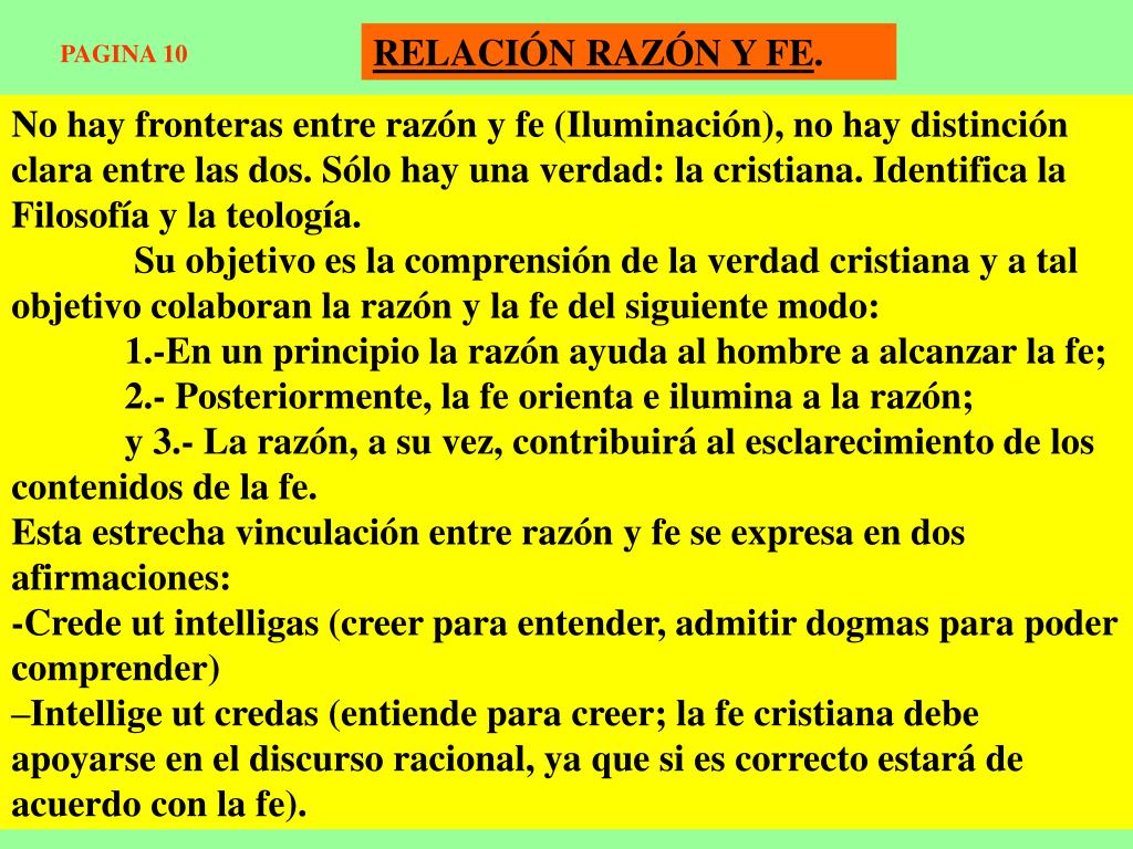 RELACIÓN RAZÓN Y FE. PAGINA 10 No hay fronteras entre razón y fe (Iluminación), no hay distinción clara entre las dos. Sólo hay una verdad: la cristiana. Identifica la Filosofía y la teología. Su objetivo es la comprensión de la verdad cristiana y a tal objetivo colaboran la razón y la fe del siguiente modo: 1.-En un principio la razón ayuda al hombre a alcanzar la fe; 2.- Posteriormente, la fe orienta e ilumina a la razón; y 3.- La razón, a su vez, contribuirá al esclarecimiento de los contenidos de la fe. Esta estrecha vinculación entre razón y fe se expresa en dos afirmaciones: -Crede ut intelligas (creer para entender, admitir dogmas para poder comprender) –Intellige ut credas (entiende para creer; la fe cristiana debe apoyarse en el discurso racional, ya que si es correcto estará de acuerdo con la fe).