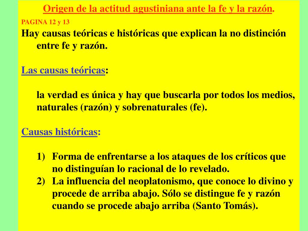 Origen de la actitud agustiniana ante la fe y la razón. • Hay causas teóricas e históricas que explican la no distinción entre fe y razón. • Las causas teóricas: • la verdad es única y hay que buscarla por todos los medios, naturales (razón) y sobrenaturales (fe). • Causas históricas: • Forma de enfrentarse a los ataques de los críticos que no distinguían lo racional de lo revelado. • La influencia del neoplatonismo, que conoce lo divino y procede de arriba abajo. Sólo se distingue fe y razón cuando se procede abajo arriba (Santo Tomás). PAGINA 12 y 13