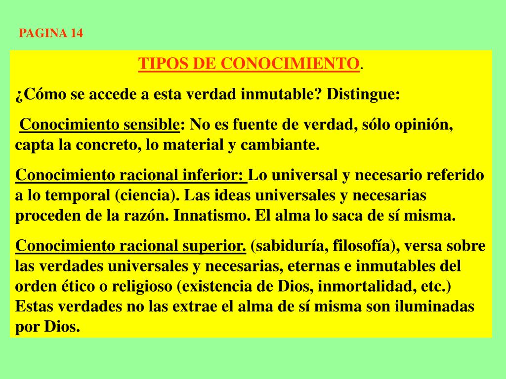 PAGINA 14 TIPOS DE CONOCIMIENTO. ¿Cómo se accede a esta verdad inmutable? Distingue: Conocimiento sensible: No es fuente de verdad, sólo opinión, capta la concreto, lo material y cambiante. Conocimiento racional inferior: Lo universal y necesario referido a lo temporal (ciencia). Las ideas universales y necesarias proceden de la razón. Innatismo. El alma lo saca de sí misma. Conocimiento racional superior. (sabiduría, filosofía), versa sobre las verdades universales y necesarias, eternas e inmutables del orden ético o religioso (existencia de Dios, inmortalidad, etc.) Estas verdades no las extrae el alma de sí misma son iluminadas por Dios.