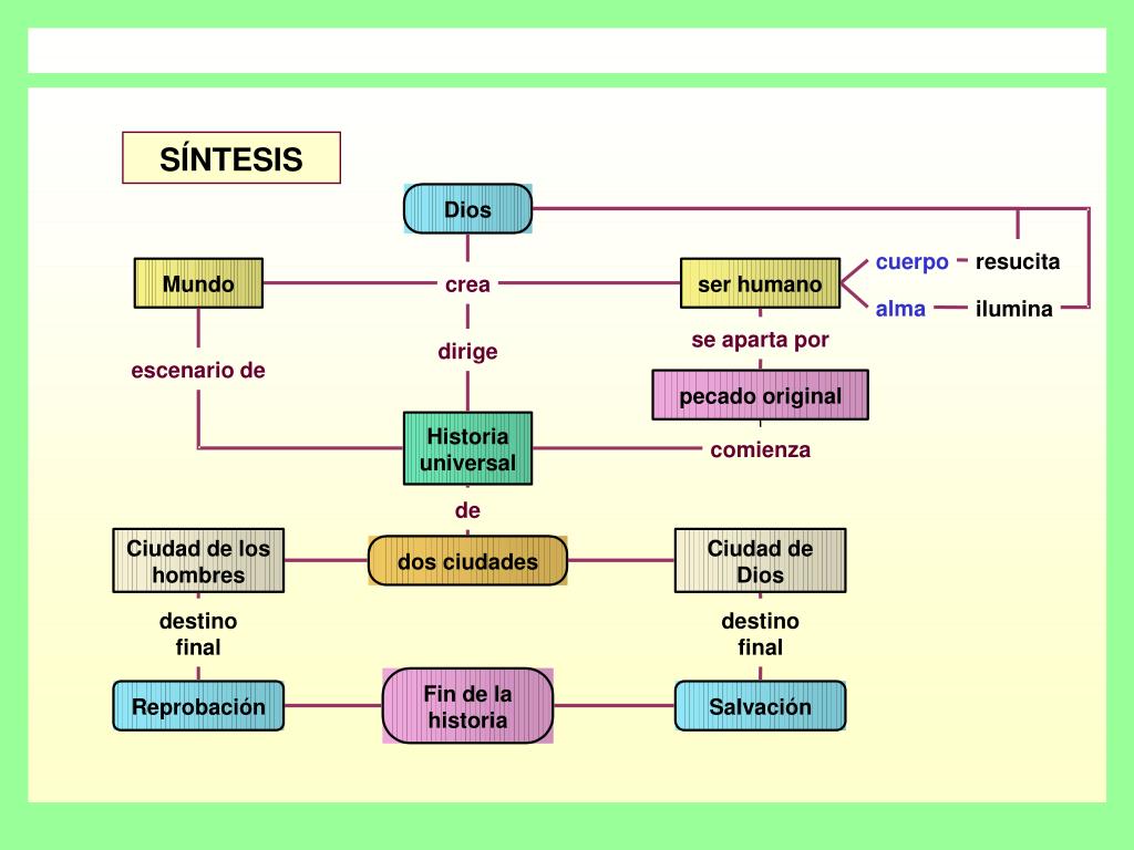 SÍNTESIS Dios cuerpo resucita Mundo crea ser humano alma ilumina se aparta por dirige escenario de pecado original Historia comienza universal de Ciudad de los Ciudad de dos ciudades hombres Dios destino destino final final Fin de la Reprobación Salvación historia