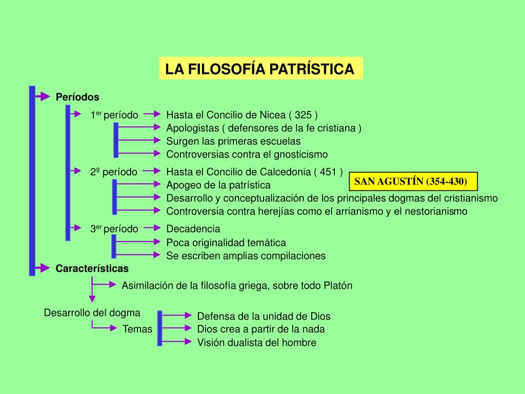 LA FILOSOFÍA PATRÍSTICA Períodos 1 período Hasta el Concilio de Nicea ( 325 ) er Apologistas ( defensores de la fe cristiana ) Surgen las primeras escuelas Controversias contra el gnosticismo 2º período Hasta el Concilio de Calcedonia ( 451 ) SAN AGUSTÍN (354-430) Apogeo de la patrística Desarrollo y conceptualización de los principales dogmas del cristianismo Controversia contra herejías como el arrianismo y el nestorianis mo 3 período Decadencia er Poca originalidad temática Se escriben amplias compilaciones Características Asimilación de la filosofía griega, sobre todo Platón Desarrollo del dogma Defensa de la unidad de Dios Temas Dios crea a partir de la nada Visión dualista del hombre
