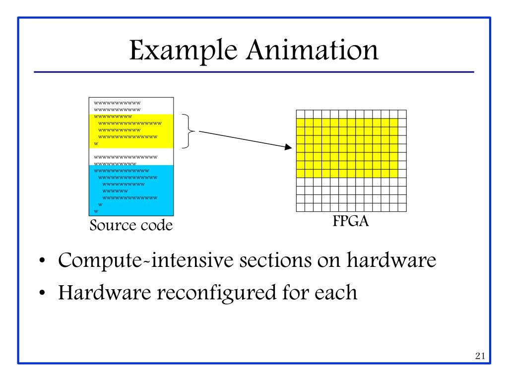 Example Animation • Compute-intensive sections on hardware • Hardware reconfigured for each wwwwwwwwwww wwwwwwwwwww wwwwwwwww wwwwwwwwwwwwwww wwwwwwwwww wwwwwwwwwwwwww w wwwwwwwwwwwwwww wwwwwwwwww wwwwwwwwwwwww wwwwwwwwwwwwww wwwwwwwwww wwwwww wwwwwwwwwwwww w w FPGA Source code