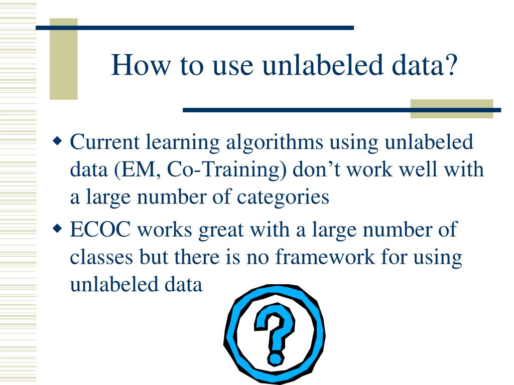 How to use unlabeled data? • Current learning algorithms using unlabeled data (EM, Co-Training) don’t work well with a large number of categories • ECOC works great with a large number of classes but there is no framework for using unlabeled data