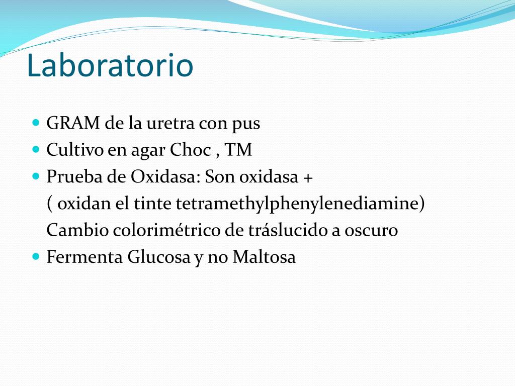 Laboratorio • GRAM de la uretra con pus • Cultivo en agar Choc , TM • Prueba de Oxidasa: Son oxidasa + ( oxidan el tinte tetramethylphenylenediamine) Cambio colorimétrico de tráslucido a oscuro • Fermenta Glucosa y no Maltosa