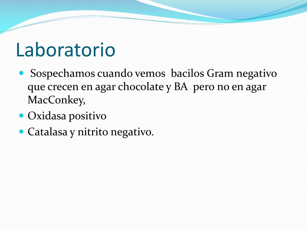 Laboratorio • Sospechamos cuando vemos bacilos Gram negativo que crecen en agar chocolate y BA pero no en agar MacConkey, • Oxidasa positivo • Catalasa y nitrito negativo.