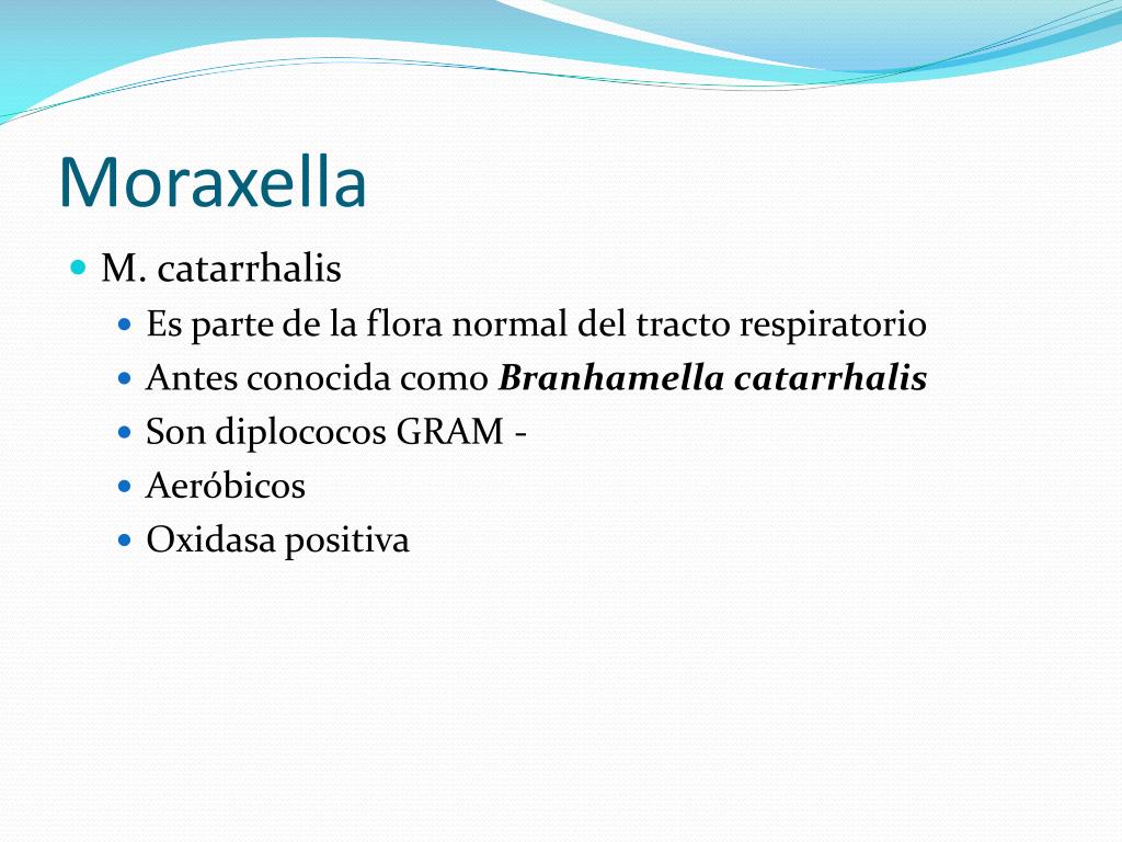 Moraxella • M. catarrhalis • Es parte de la flora normal del tracto respiratorio • Antes conocida como Branhamella catarrhalis • Son diplococos GRAM - • Aeróbicos • Oxidasa positiva