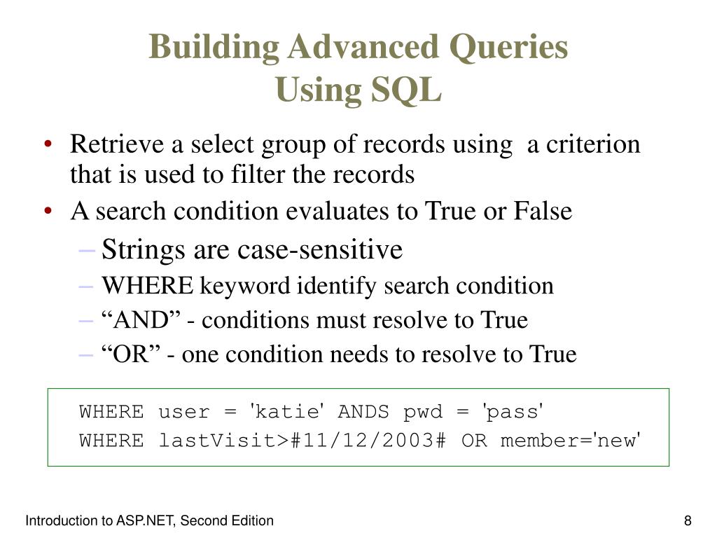 Building Advanced Queries Using SQL • Retrieve a select group of records using a criterion that is used to filter the records • A search condition evaluates to True or False • Strings are case-sensitive • WHERE keyword identify search condition • “AND” - conditions must resolve to True • “OR” - one condition needs to resolve to True WHERE user = 'katie' ANDS pwd = 'pass' WHERE lastVisit>#11/12/2003# OR member='new' Introduction to ASP.NET, Second Edition