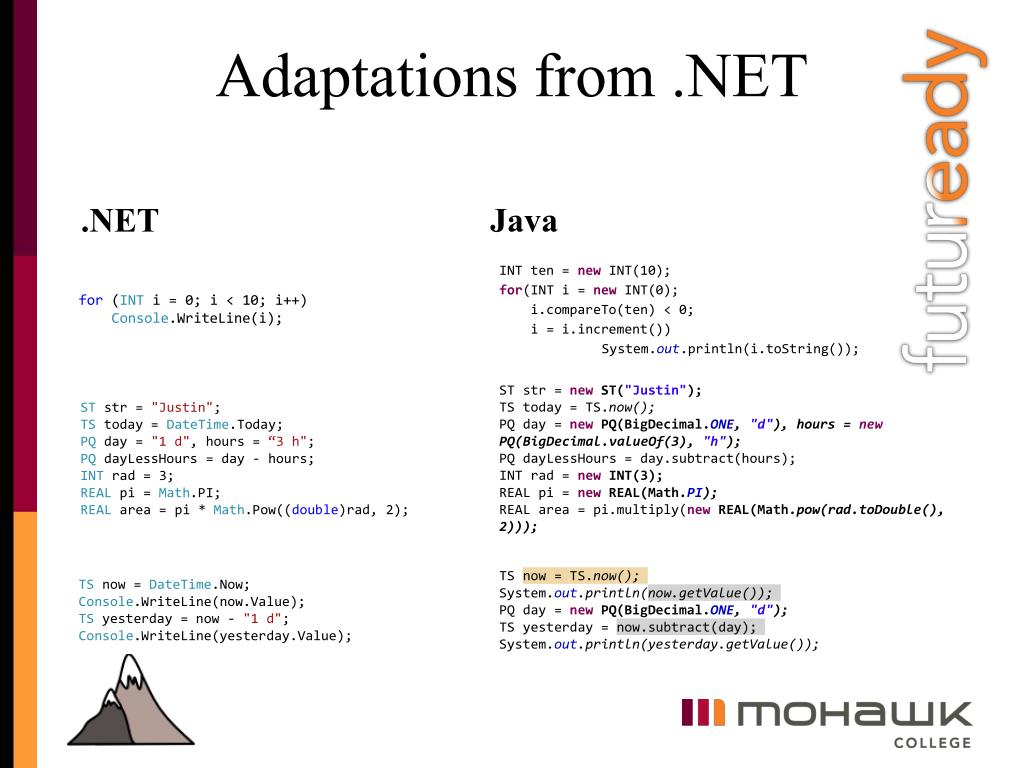 Adaptations from .NET Java .NET INT ten = new INT(10); for(INT i = new INT(0); i.compareTo(ten) < 0; i= i.increment()) System.out.println(i.toString()); for (INT i = 0; i < 10; i++) Console.WriteLine(i); ST str = new ST("Justin"); TS today = TS.now(); PQ day = new PQ(BigDecimal.ONE, "d"), hours = new PQ(BigDecimal.valueOf(3), "h"); PQ dayLessHours = day.subtract(hours); INT rad = new INT(3); REAL pi = new REAL(Math.PI); REAL area = pi.multiply(new REAL(Math.pow(rad.toDouble(), 2))); STstr = "Justin"; TS today = DateTime.Today; PQ day = "1 d", hours = “3 h"; PQdayLessHours = day - hours; INTrad = 3; REAL pi = Math.PI; REAL area = pi * Math.Pow((double)rad, 2); TS now = TS.now(); System.out.println(now.getValue()); PQ day = new PQ(BigDecimal.ONE, "d"); TS yesterday = now.subtract(day); System.out.println(yesterday.getValue()); TS now = DateTime.Now; Console.WriteLine(now.Value); TS yesterday = now - "1 d"; Console.WriteLine(yesterday.Value);