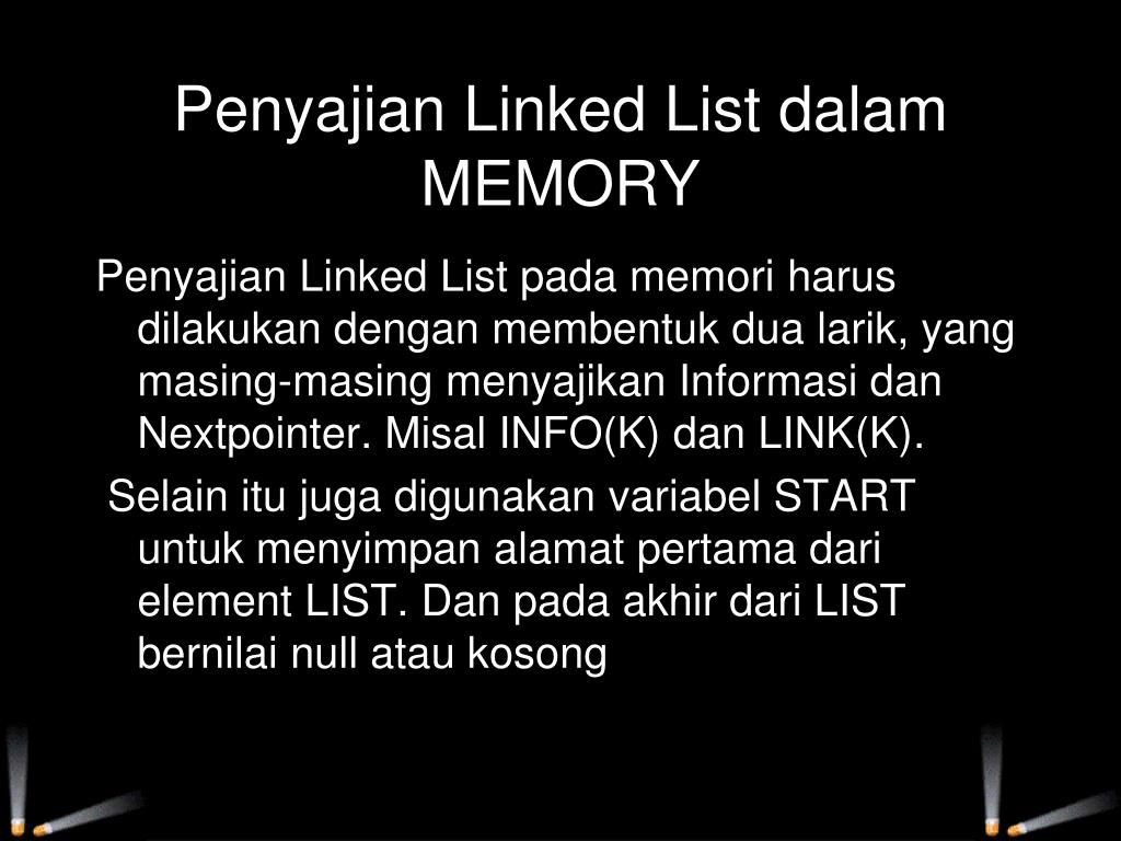 Penyajian Linked List dalam MEMORY Penyajian Linked List pada memori harus dilakukan dengan membentuk dua larik, yang masing-masing menyajikan Informasi dan Nextpointer. Misal INFO(K) dan LINK(K). Selain itu juga digunakan variabel START untuk menyimpan alamat pertama dari element LIST. Dan pada akhir dari LIST bernilai null atau kosong