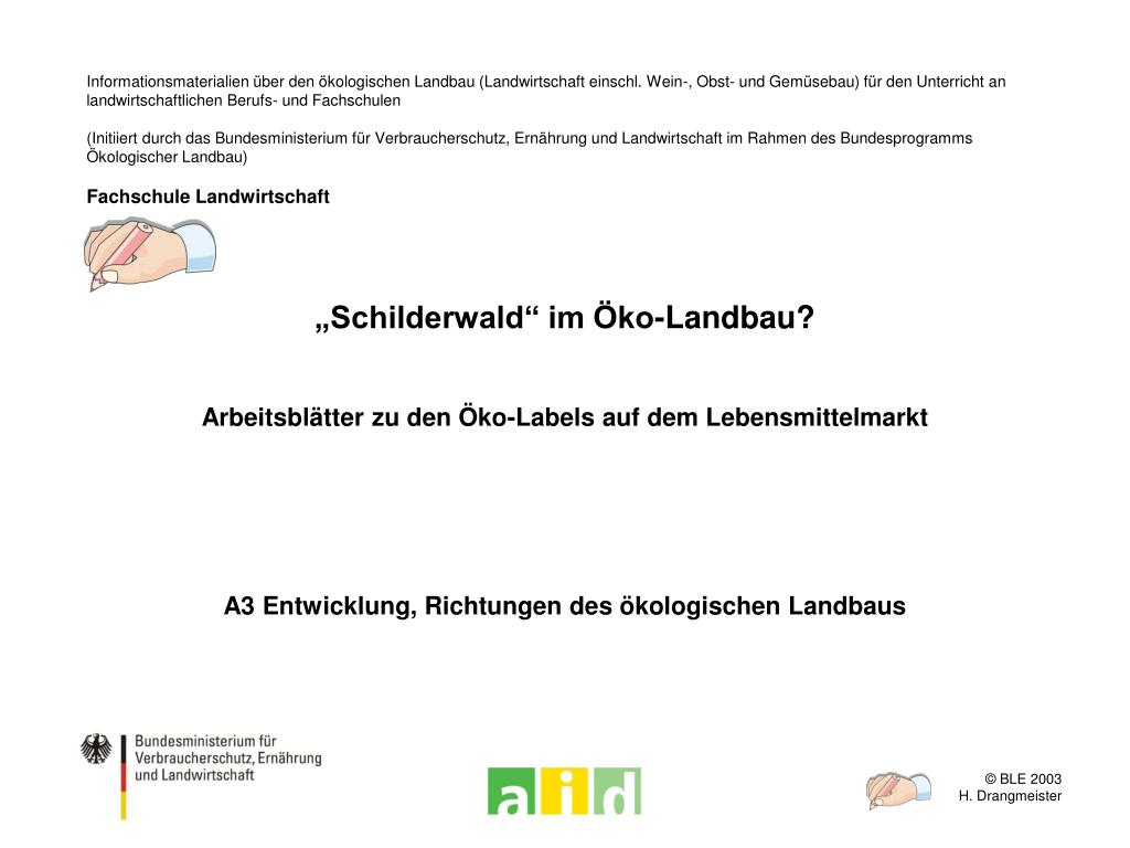 Informationsmaterialien über den ökologischen Landbau (Landwirtschaft einschl. Wein-, Obst- und Gemüsebau) für den Unterricht an landwirtschaftlichen Berufs- und Fachschulen (Initiiert durch das Bundesministerium für Verbraucherschutz, Ernährung und Landwirtschaft im Rahmen des Bundesprogramms Ökologischer Landbau) Fachschule Landwirtschaft „Schilderwald“ im Öko-Landbau? Arbeitsblätter zu den Öko-Labels auf dem Lebensmittelmarkt A3 Entwicklung, Richtungen des ökologischen Landbaus 1 / 6