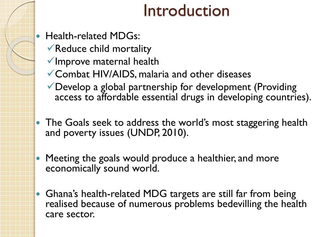 Introduction • Health-related MDGs: • Reduce child mortality • Improve maternal health • Combat HIV/AIDS, malaria and other diseases • Develop a global partnership for development (Providing access to affordable essential drugs in developing countries). • The Goals seek to address the world’s most staggering health and poverty issues (UNDP, 2010). • Meeting the goals would produce a healthier, and more economically sound world. • Ghana’s health-related MDG targets are still far from being realisedbecause of numerous problems bedevilling the health care sector.