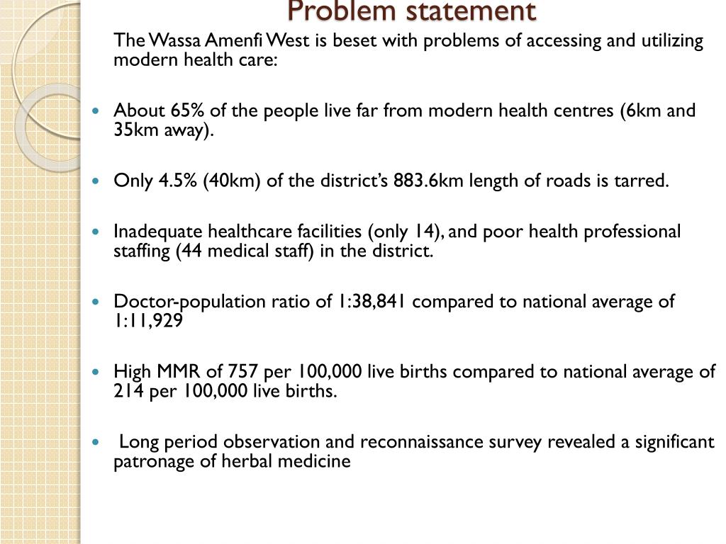 Problem statement The Wassa Amenfi West is beset with problems of accessing and utilizing modern health care: • About 65% of the people live far from modern health centres (6km and 35km away). • Only 4.5% (40km) of the district’s 883.6km length of roads is tarred. • Inadequate healthcare facilities (only 14), and poor health professional staffing (44 medical staff) in the district. • Doctor-population ratio of 1:38,841 compared to national average of 1:11,929 • High MMR of 757 per 100,000 live births compared to national average of 214 per 100,000 live births. • Long period observation and reconnaissance survey revealed a significant patronage of herbal medicine